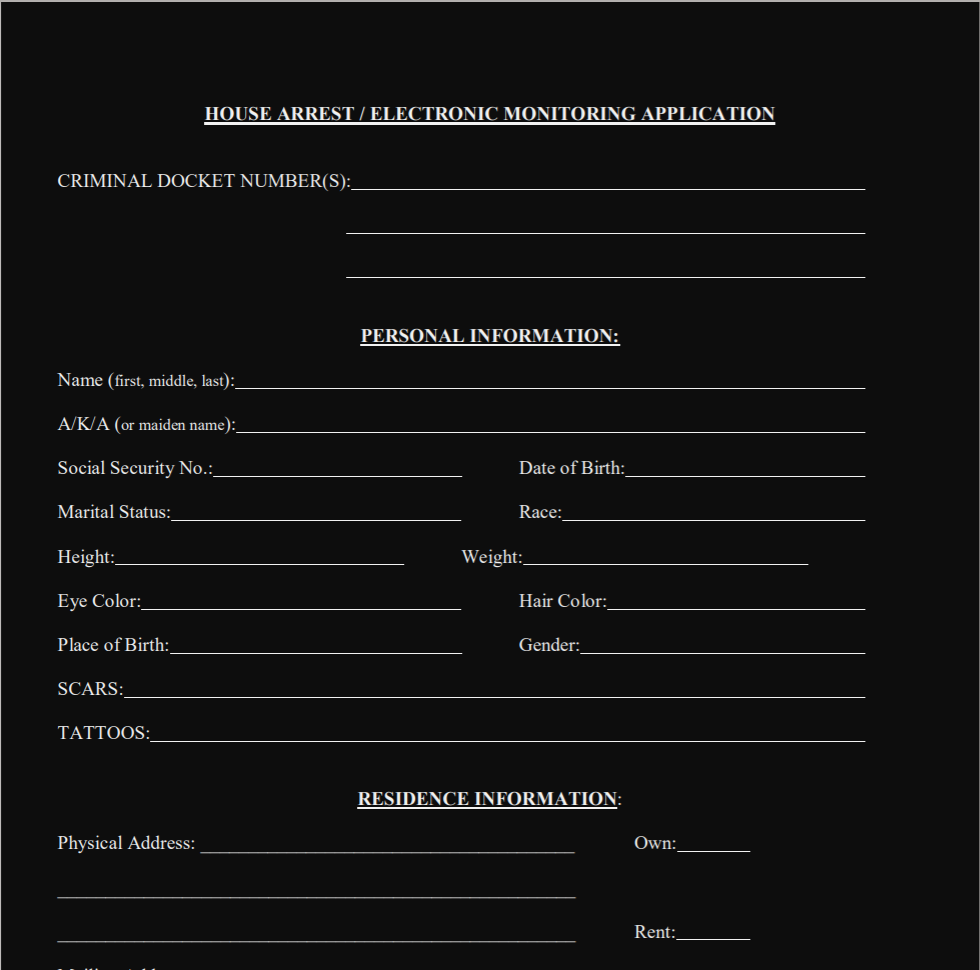 In Montgomery County Pennsylvania, for example, you will have to fill out a House Arrest Suitability Application, See the screenshot below or (https://montcopa.org/DocumentCenter/View/703/House-ArrestElectronic-Monitoring-Program?bidId=) If you are in jail or on parole, or probation, you may ask your parole or case officer for an application. To complete the application; You will need a letter from the people you live with acknowledging that home incarceration will not negatively affect them and not jeopardize your success if accepted into the program. A letter from your employer, another from your counsellor. Or a letter from your doctor if you have a medical issue.